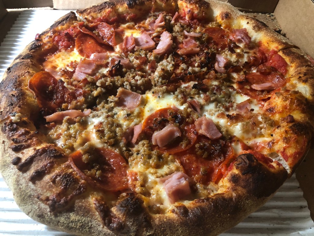 So I ordered a small brick oven Carnivore Pizza, and let me tell you, “No lies detected folks.” It was loaded. It was hearty! And it was packed and stacked with sausage, pepperoni, bacon, ham, and meatballs. The fresh homemade pie crust was awesome as well.