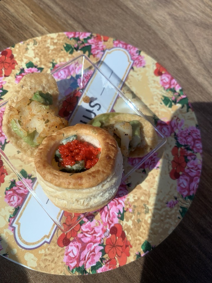 The eating was good, and I mean really good. And the price tag does justify good eating. When you choose the luxe experience, Tea Around Town gives you a taste of the high life. Options include a lobster roll, plus caviar served on crème fraîche. For a luxe level dessert, they offer an exquisite Ferrero Velvet Delight. It combines red velvet cake, Nutella Mousse, hazelnut crumbles, and Ferrero Rocher. There are also other treats.